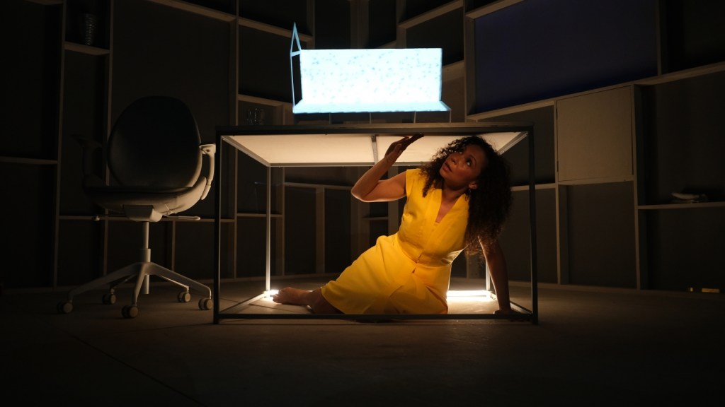 La mise en scène choisit la sobriété et l’épurement. Pas de grands effets spectaculaires, pas de décors surréalistes. Et c’est justement ce qui fonctionne. Le décor minimaliste laisse toute la place au texte et à l’interprétation. Les accessoires sont simples mais bien choisis, comme la fameuse boule de rotin qui symbolise à merveille le marketing fourbe des maisons à vendre. Chaque élément a un sens. On sent que rien n’est laissé au hasard, tout est au service de l’histoire.
